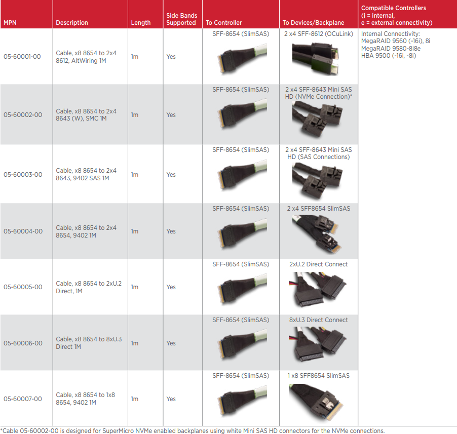 These cables enable connections from 9400 series MegaRAID and HBA Tri-Mode Adapters to NVMe storage