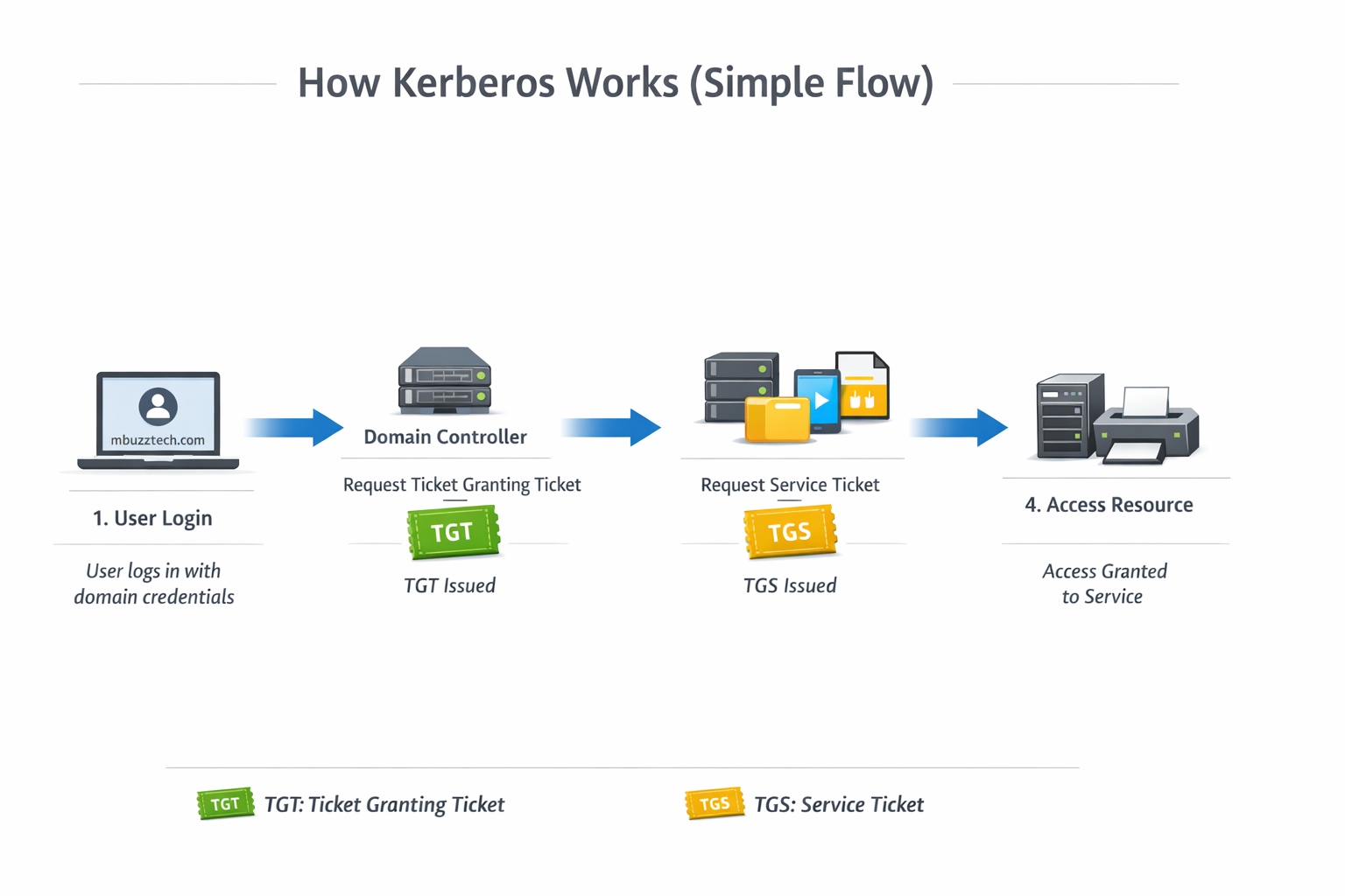 User logs in using domain credentials (mbuzztech.com) TGT Request (Ticket Granting Ticket)